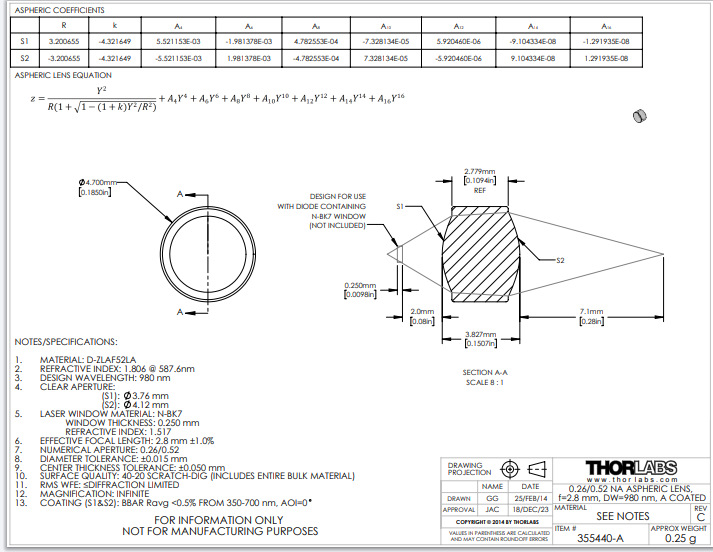 THORLABS 索雷博 355440-A 非球面透镜