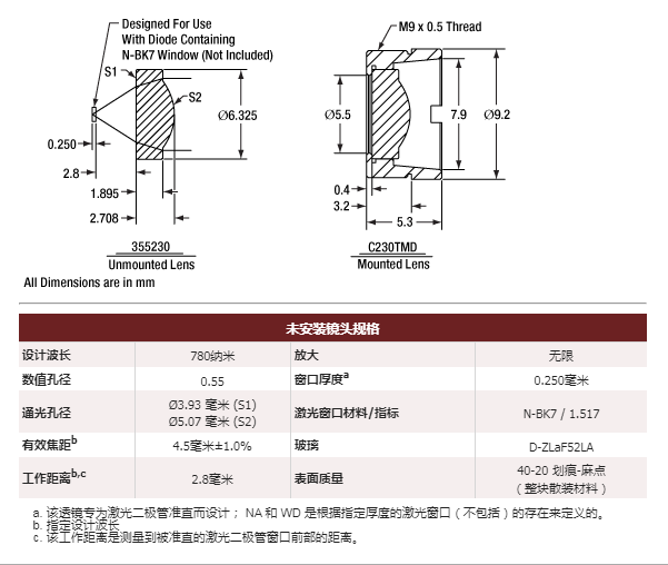 Thorlabs索雷博 A230TM-A 非球面透镜