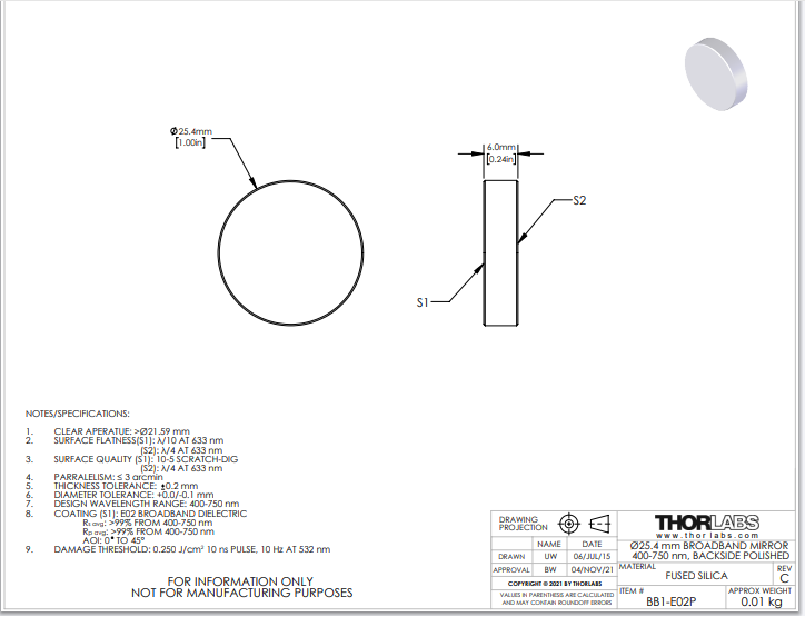 Thorlabs索雷博 BB1-E02P 背面抛光反射镜