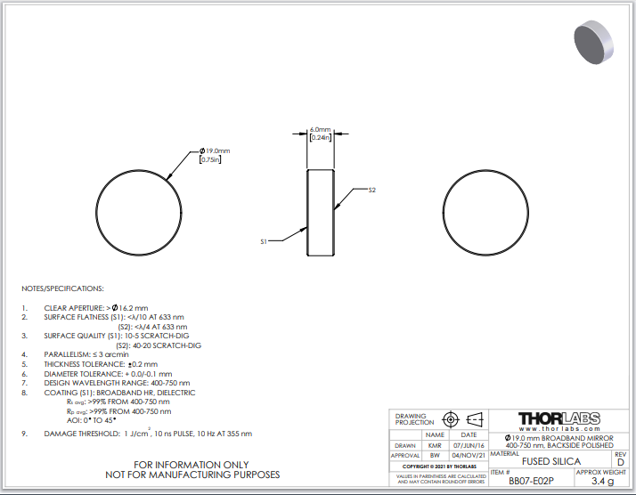 Thorlabs索雷博       BB07-E02P   背面抛光反射镜