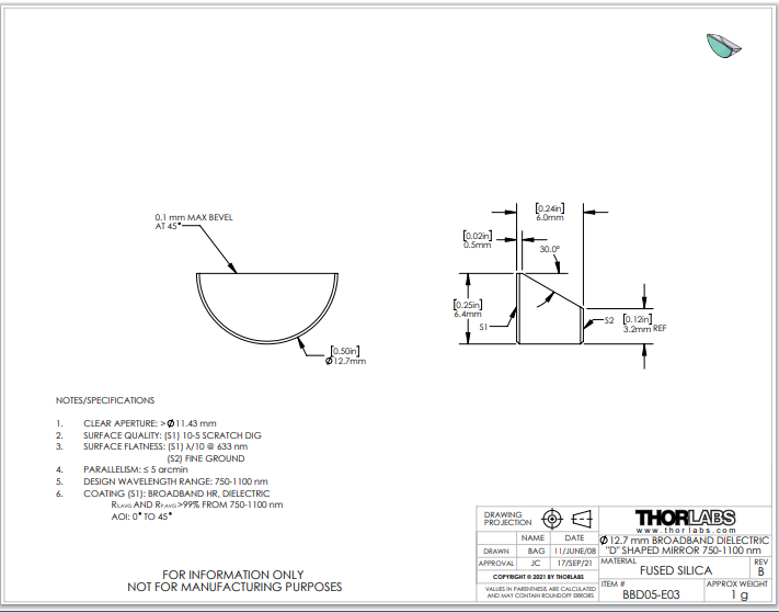 THORLABS 索雷博   BBD05-E03 D形反射镜