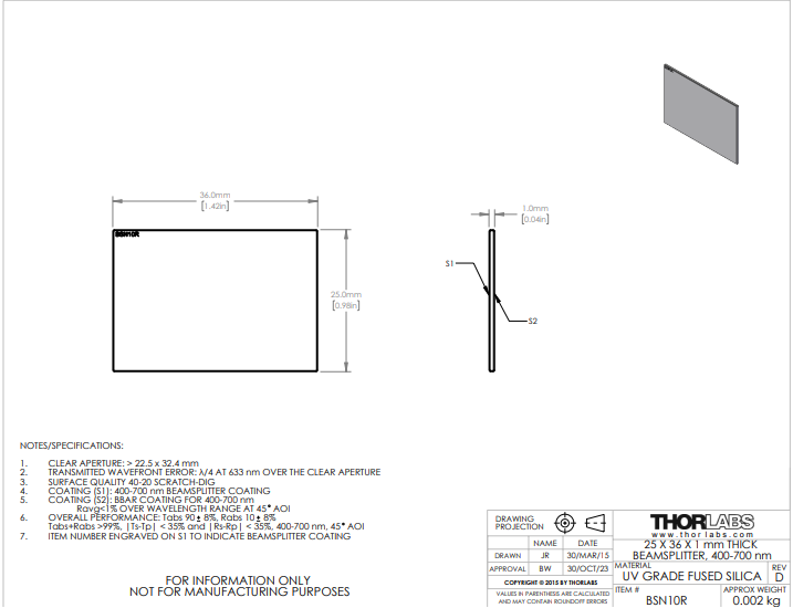 THORLABS 索雷博   BSN10R 紫外熔融石英平板分束镜