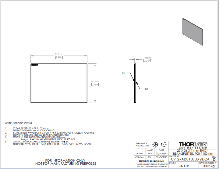 THORLABS 索雷博 BSN11R 平板分束镜