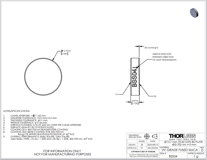 Thorlabs索雷博 BSS04 紫外熔融石英平板分束镜
