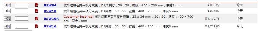 Thorlabs索雷博 BSW10 紫外熔融石英平板分束镜
