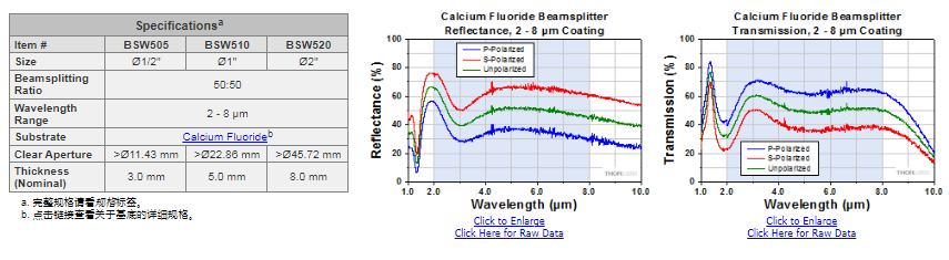 Thorlabs索雷博 BSW510 氟化钙平板分束镜