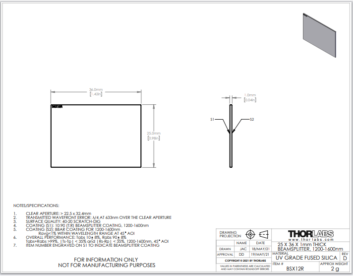 THORLABS 索雷博 BSX12R UVFS平板分束镜