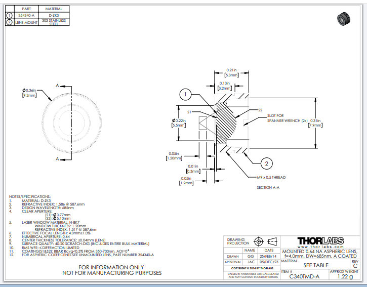 THORLABS 索雷博 C340TMD-A 非球面透镜