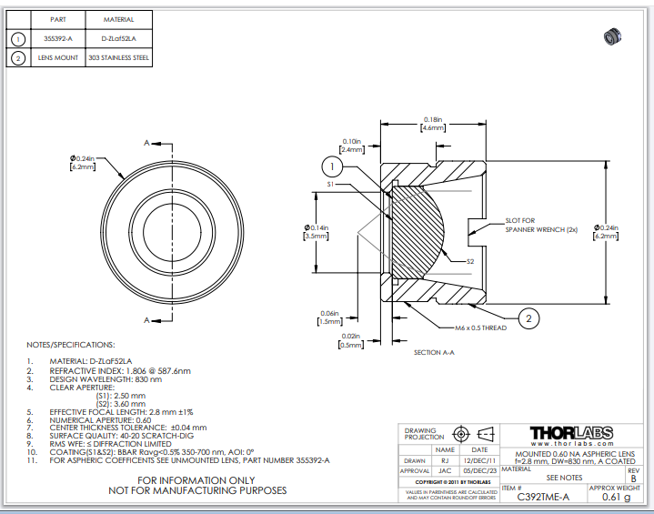 Thorlabs索雷博 C392TME-A 非球面透镜