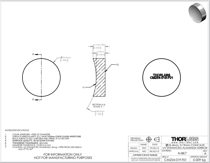 Thorlabs索雷博 CM254-019-F01 凹面反射镜