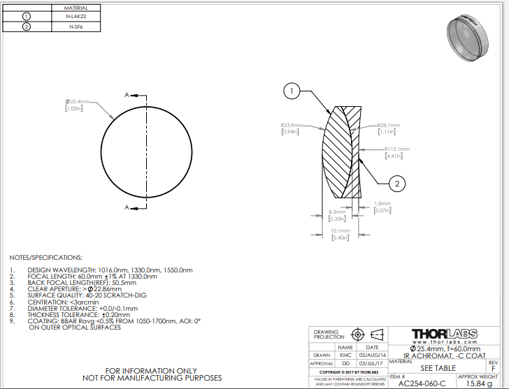 Thorlabs索雷博 AC254-060-C 消色差双胶合透镜