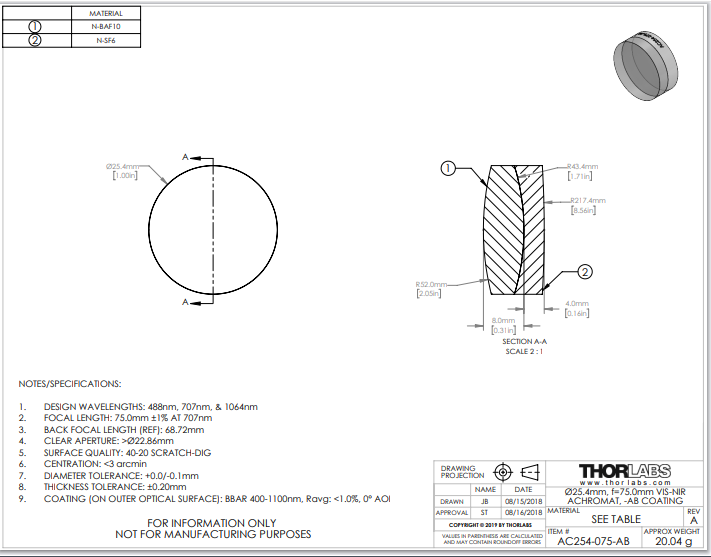 Thorlabs索雷博 AC254-075-AB 消色差双胶合透镜