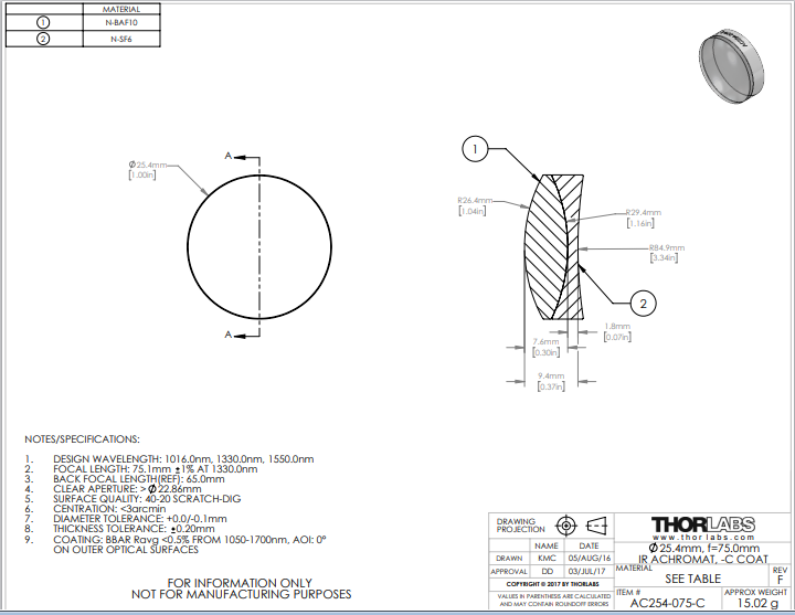 Thorlabs索雷博 AC254-075-C 消色差双胶合透镜