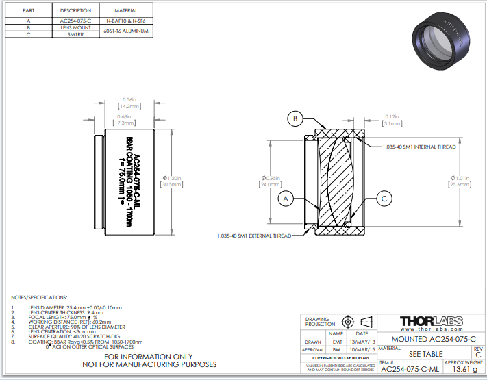 Thorlabs索雷博 AC254-075-C-ML 消色差双胶合透镜