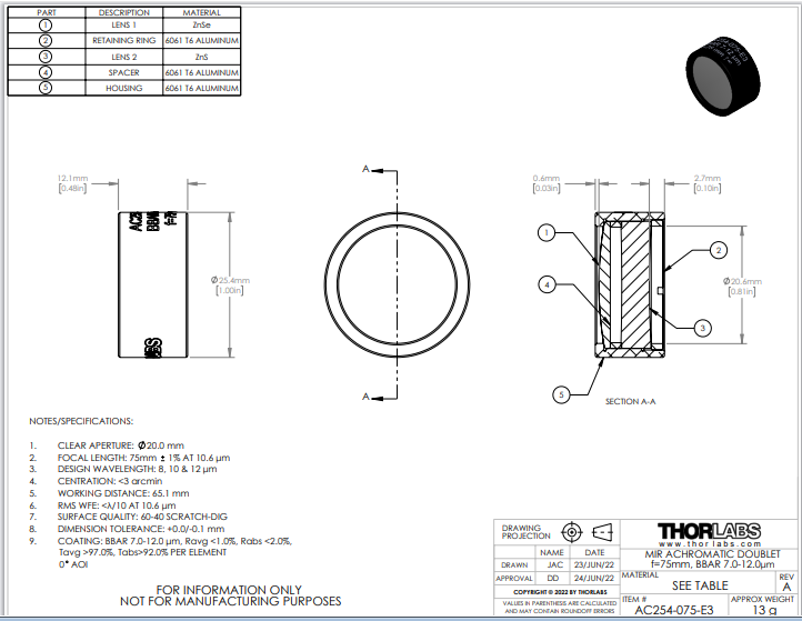 Thorlabs索雷博 AC254-075-E3 空气隙消色差双合透镜
