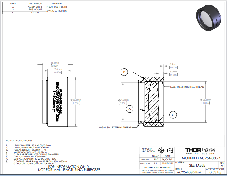 Thorlabs索雷博 AC254-080-B-ML 消色差双胶合透镜