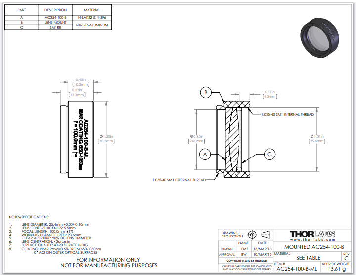 Thorlabs索雷博 AC254-100-B-ML 消色差双胶合透镜