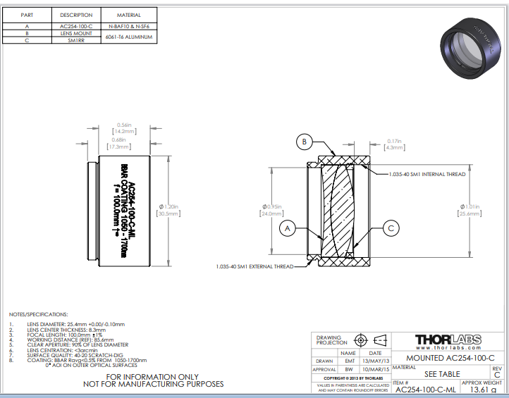 Thorlabs索雷博 AC254-100-C-ML 消色差双胶合透镜