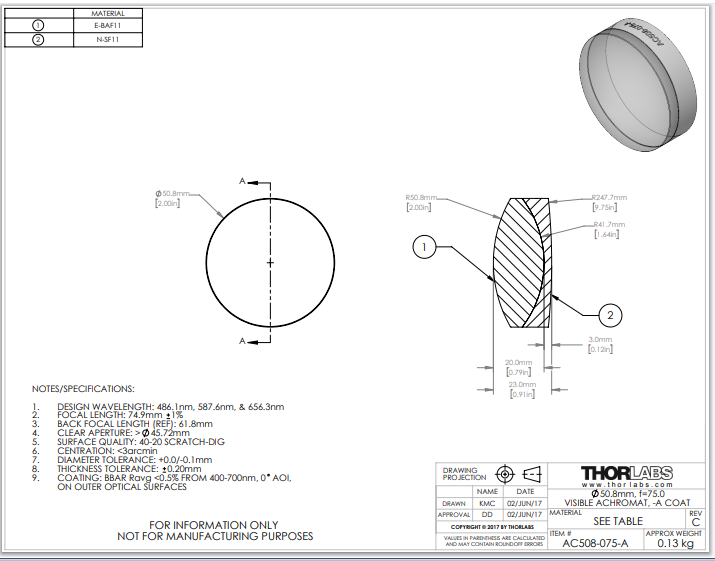 Thorlabs索雷博 AC508-075-A 消色差双胶合透镜