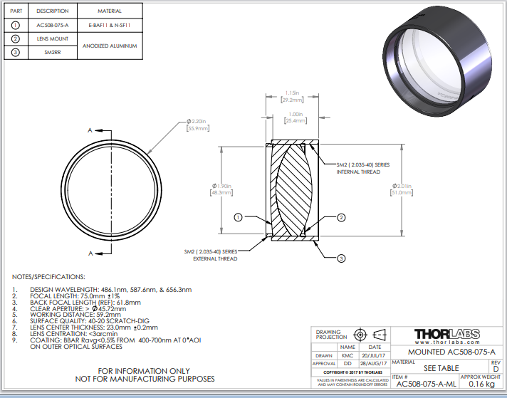 THORLABS 索雷博    AC508-075-A-ML 消色差双胶合透镜