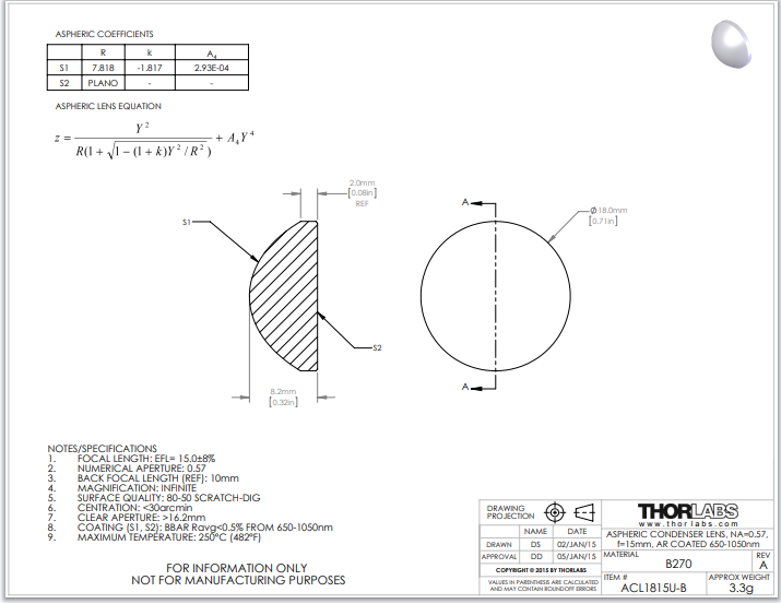 Thorlabs索雷博 ACL1815U-B 非球面聚光透镜