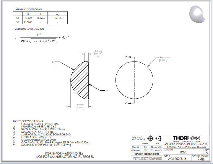 THORLABS 索雷博   ACL2520U-B 非球面聚光透镜