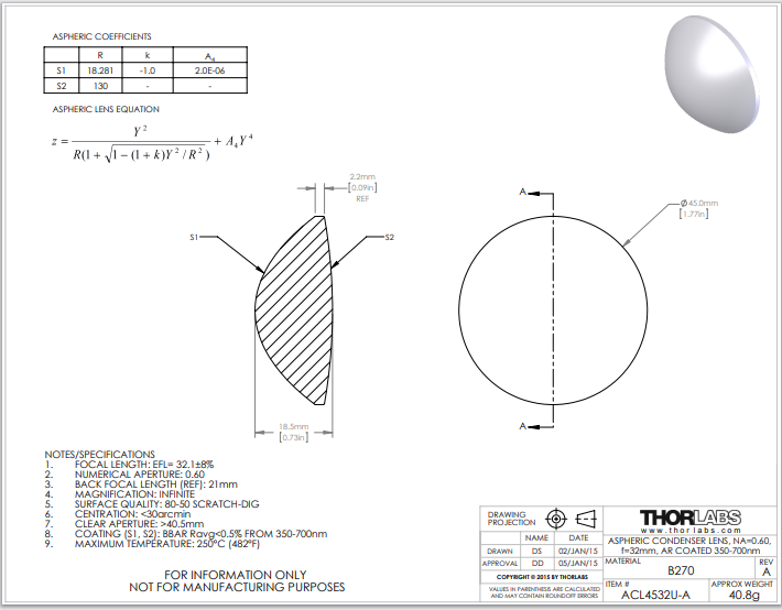 型号 ACL4532U-A 非球面聚光透镜 品牌 THORLABS 索雷博