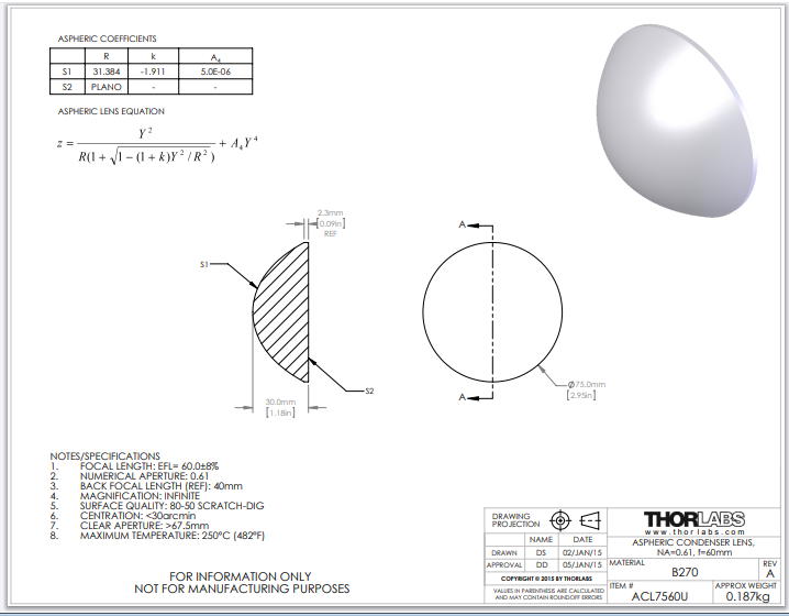 Thorlabs索雷博 ACL7560U 非球面聚光透镜