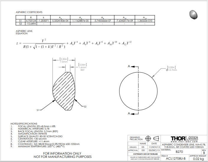 THORLABS 索雷博    ACL12708U-B 非球面聚光透镜