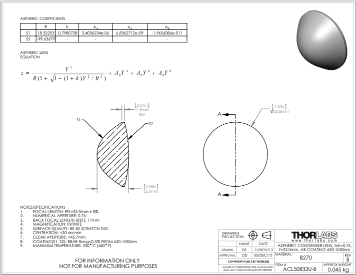 Thorlabs索雷博 ACL50832U-B 非球面聚光透镜