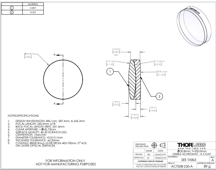 THORLABS 索雷博    ACT508-250-A 消色差双胶合透镜