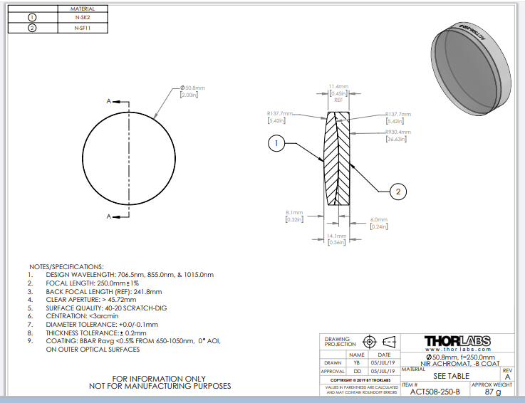 Thorlabs索雷博     ACT508-250-B   消色差双胶合透镜