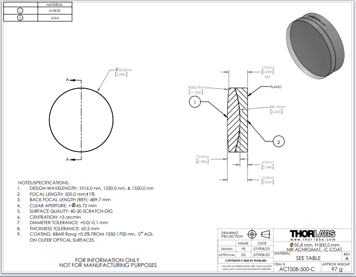 THORLABS 索雷博    ACT508-500-C 消色差双胶合透镜