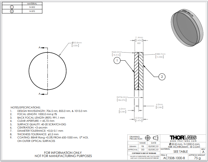 Thorlabs索雷博 ACT508-1000-B 消色差双胶合透镜
