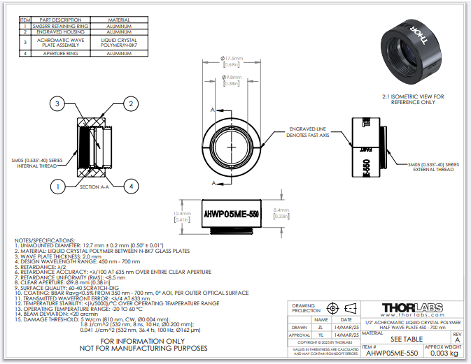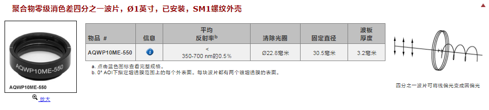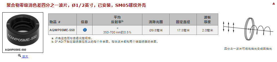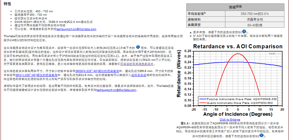 Thorlabs索雷博 AHWP05ME-550 - 聚合物零级消色差半波片