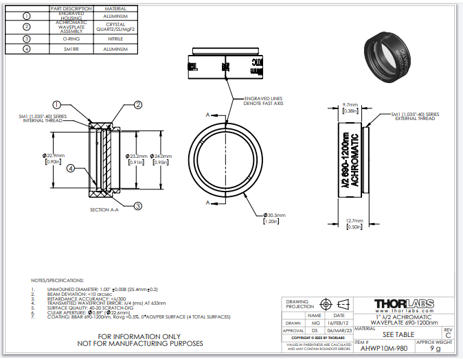 THORLABS 索雷博     AHWP10M-980 - 消色差半波片