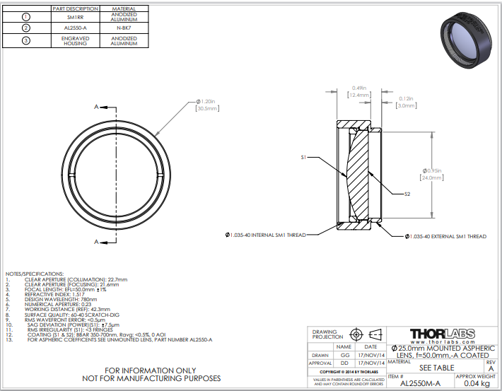 THORLABS 索雷博 AL2550M-A 非球面透镜