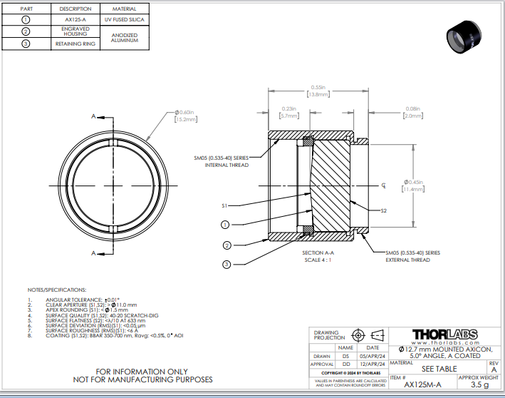 外壳螺纹 (内螺纹和外螺纹) | SM05 (0.535"-40) | SM1 (1.035"-40) |