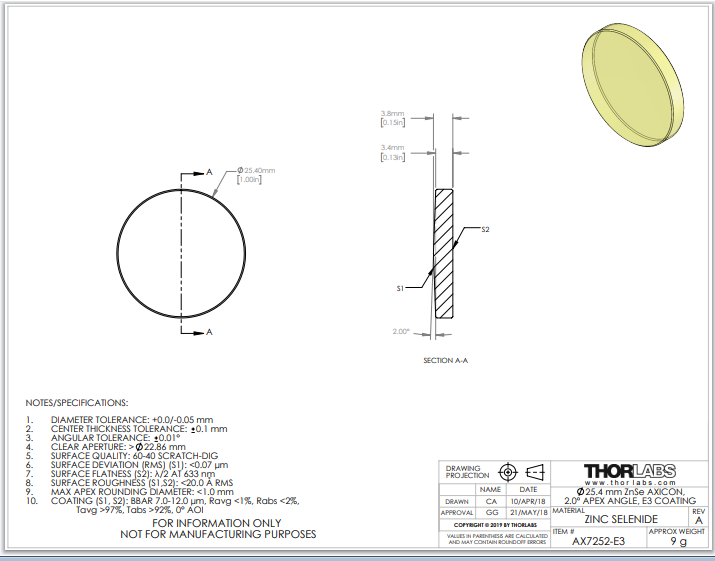 THORLABS 索雷博   AX7252-E3 锥透镜