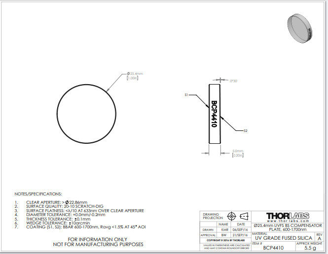 Thorlabs索雷博 BCP4410 - 紫外熔融分束镜补偿片