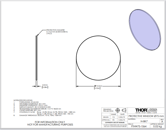 Thorlabs索雷博 FTHW75-1064 - 保护窗口片