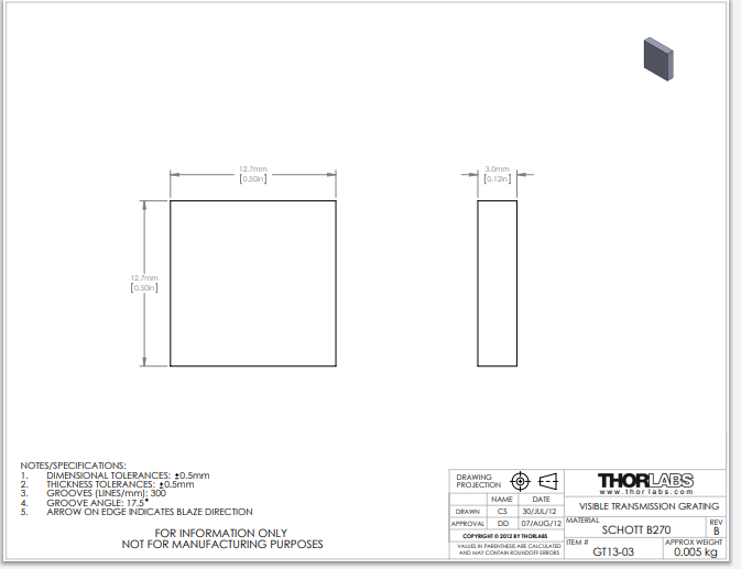 Thorlabs索雷博 GT13-03 - 可见光透射光栅