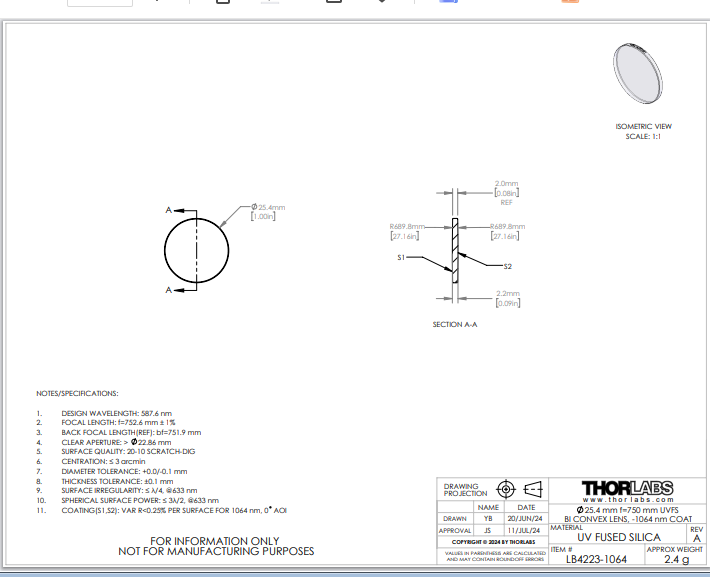 Thorlabs索雷博 LB4223-1064 双凸透镜