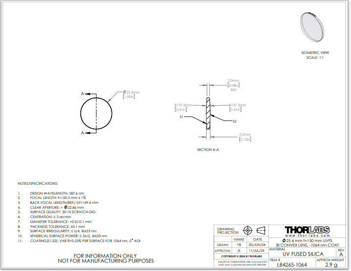 Thorlabs索雷博 LB4265-1064 双凸透镜