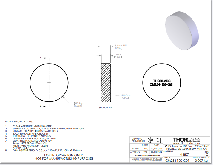 Thorlabs索雷博 CM254-100-G01 镀铝凹面镜