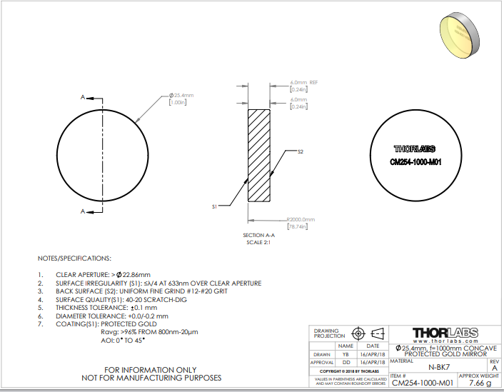 Thorlabs索雷博 CM254-1000-M01 镀金凹面镜