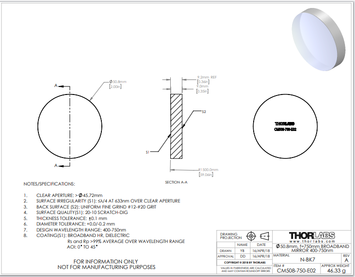 Thorlabs索雷博 CM508-750-E02 介质膜凹面反射镜