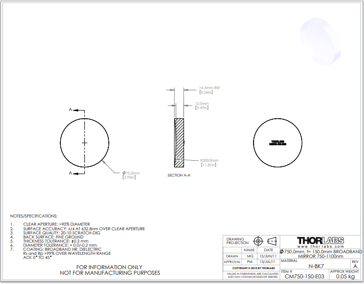 Thorlabs索雷博 CM750-150-E03 Ø75 mm介质膜凹面反射镜