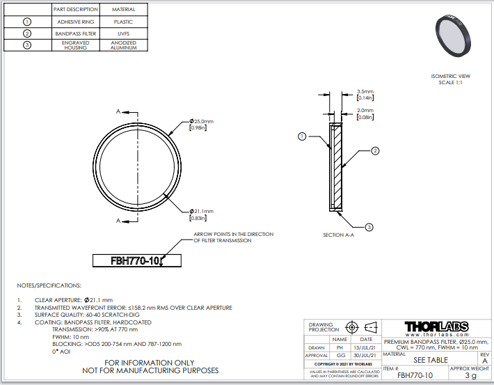 Thorlabs索雷博 FBH770-10 硬膜带通滤光片