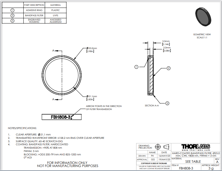 Thorlabs索雷博 FBH808-3 硬膜带通滤光片
